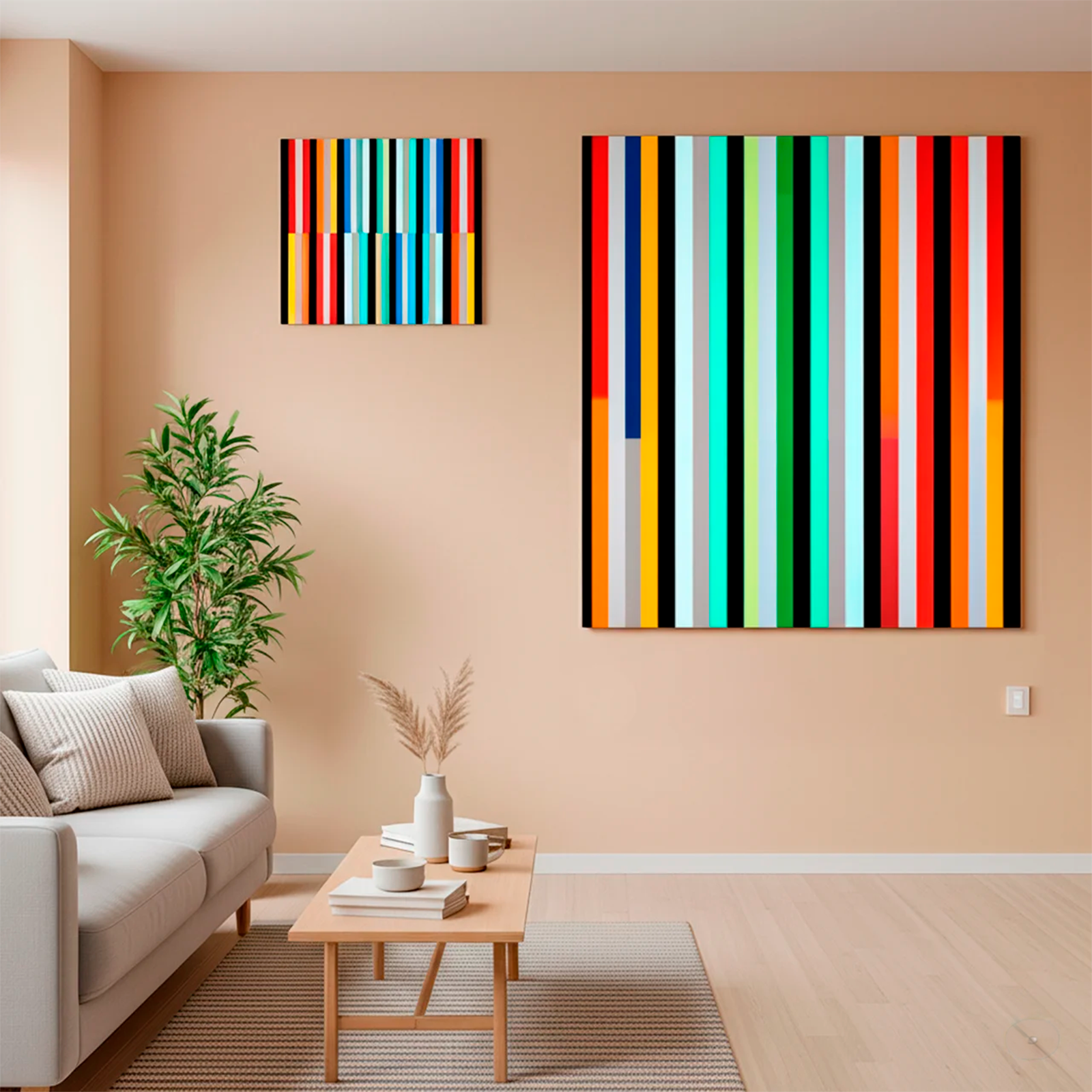 The use of vertical bands in a palette of bold colors creates a sense of movement within order.